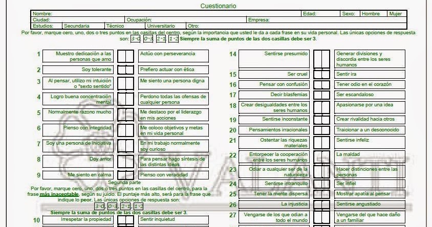 Respuestas Correctas Para Test Valanti respuestas correctas para test valanti. DOWNLOAD: https://cinurl.com/1jkgkh. Se usar叩 un test de formato electr坦nico, .... Respuestas Correctas Para Test Valanti ->>> DOWNLOAD. Conozca cmo presentar una prueba psicotcnica - universia.net.co Estos test son .. VALANTI the Questionnaire with 60 items, taking the original test Author: Ps. Octavio Augusto ... Se aplicó el Cuestionario VALANTI, con 60 ítems, tomándose de la prueba original del Autor: Ps. ... correcta interpretación; así puede ... relacionar el número correspondiente con la alternativa de respuesta para cada una de.. La prueba se presenta en un formato no reutilizable dado que incluye los espacios para registrar las respuestas a los ítems. El cuestionario determina el tipo de .... Cuestionario VALANTI completo para evaluar valores empresariales vs valores ... Manual, hoja de preguntas-respuesta. ... el formato ... 98cc185845